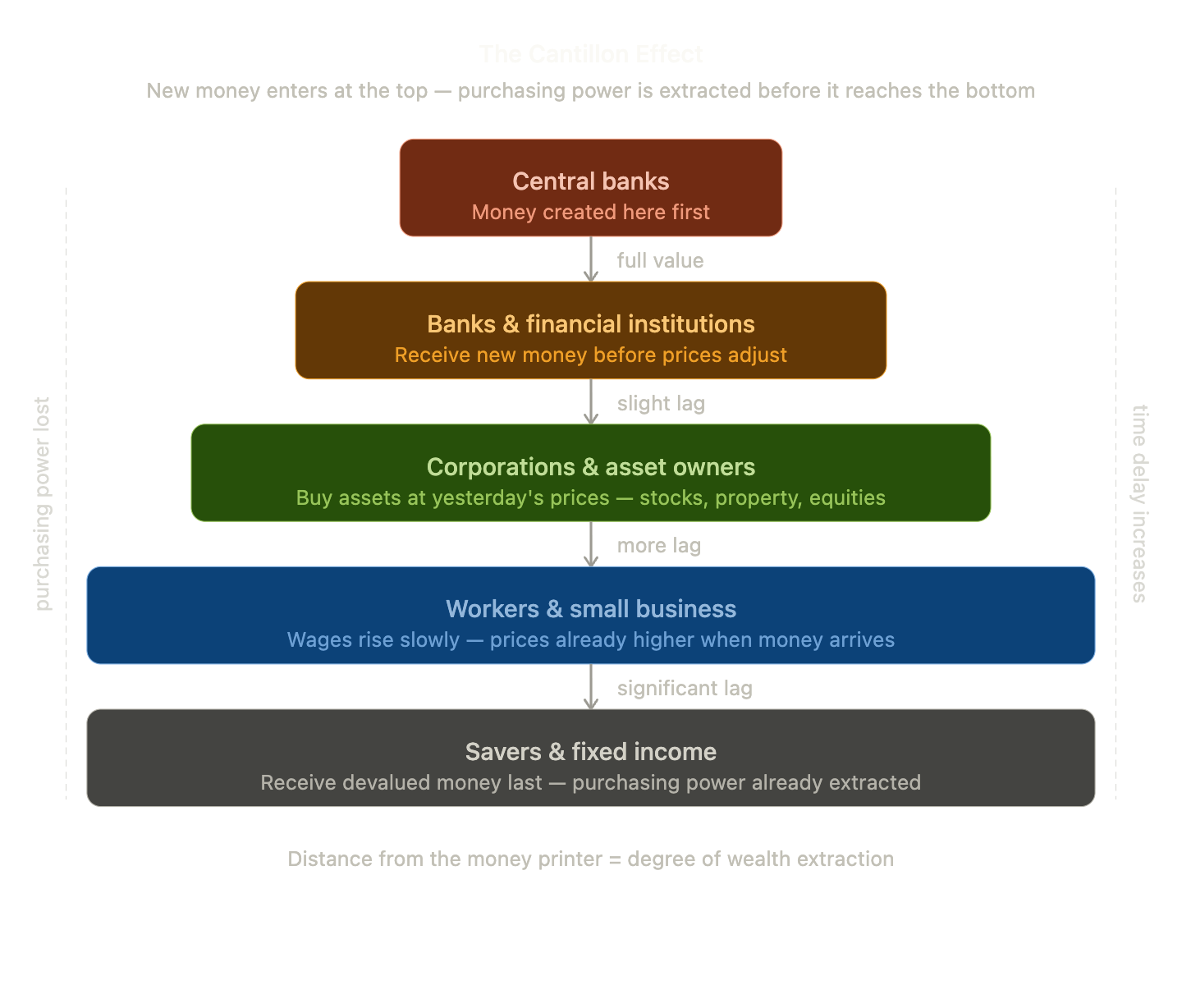 Here's how it works. New money doesn't appear everywhere simultaneously. It enters the economy at a specific point, through banks, through government spending, through bond markets. The people closest to that entry point receive the new money before prices have adjusted. They buy assets, property, and equities at yesterday's prices. By the time the money filters down to wages and savings, prices have already risen. The purchasing power has already been extracted.